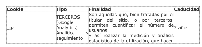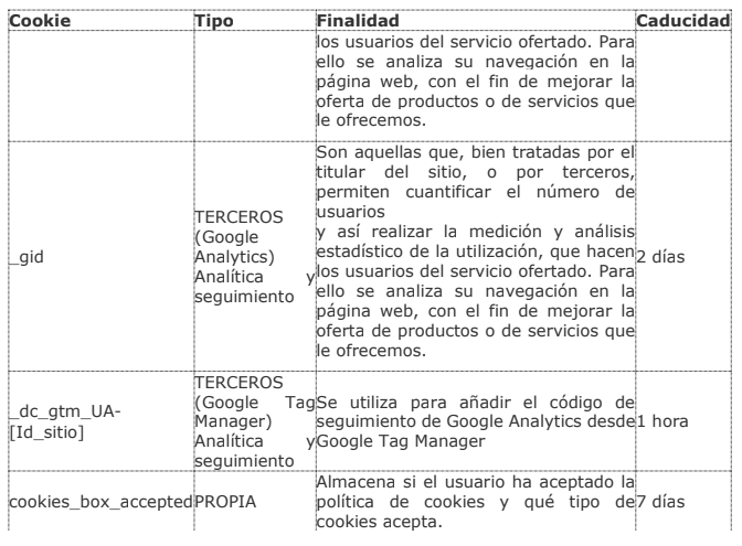 Cookies de análisis: estas cookies se utilizan para proporcionarnos información estadística sobre el funcionamiento de nuestro Sitio (p.ej. para contar visitas, conocer las fuentes de tráfico, etc.).